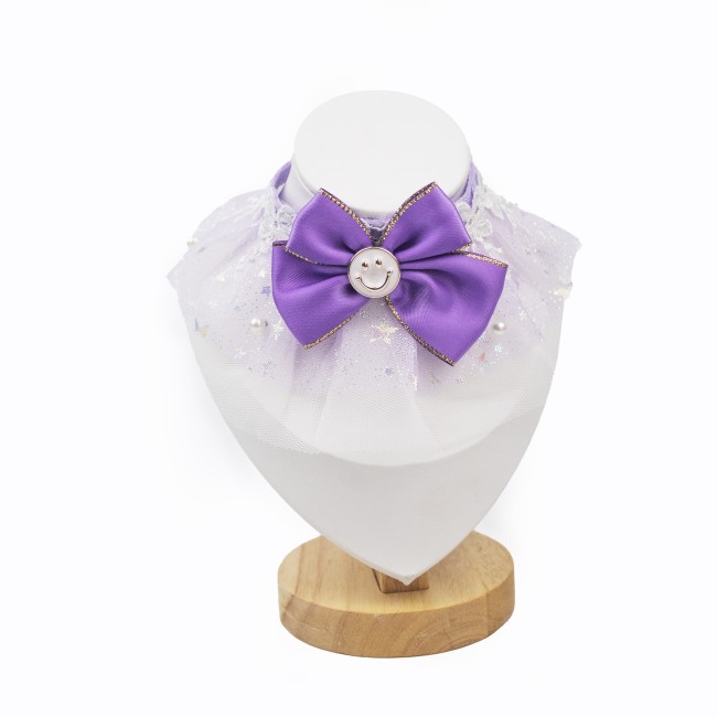 Collar con moño en el centro y cinta de tela ajustable. Talla M. Material: Poliéster Color: morado, rosado, negro, blanco Disponible: Razas pequeñas y medianas