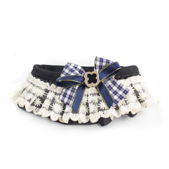 Collar con moño en el centro y cinta de tela ajustable. Material: Poliéster Color: morado, rosado, negro, blanco Disponible: Razas pequeñas Medidas: Talla S / Largo 20 cm *Ancho8 cm Talla M : Largo25 cm *Ancho11 cm
