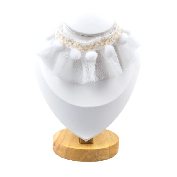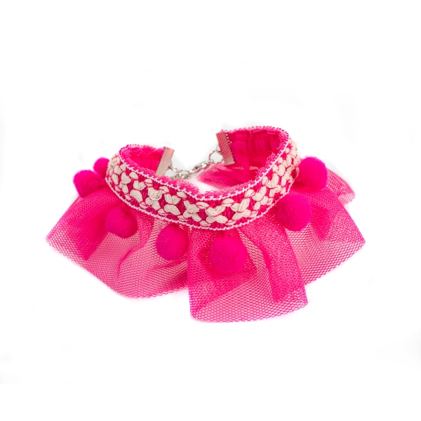Collar tipo tutú con bolitas de felpa pequeñas incrustadas alrededor y cadena de metal para ajustar a la medida. Material: Poliéster Color: Azul, rosado, blanco, fucsia Disponible: Razas pequeñas. Medidas: 10 cm