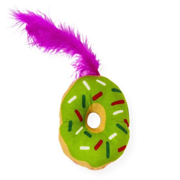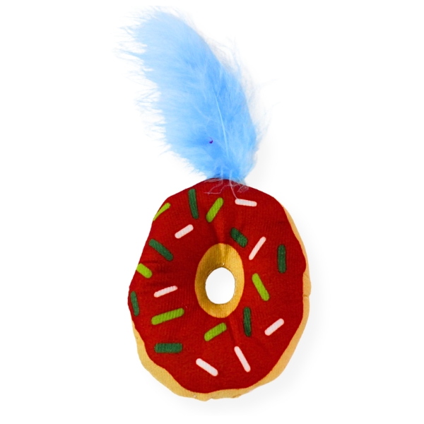 Juguete dona de felpa para mascotas, cuenta con pluma. Material: Poliéster Color: Verde, rojo Disponible: Razas pequeñas