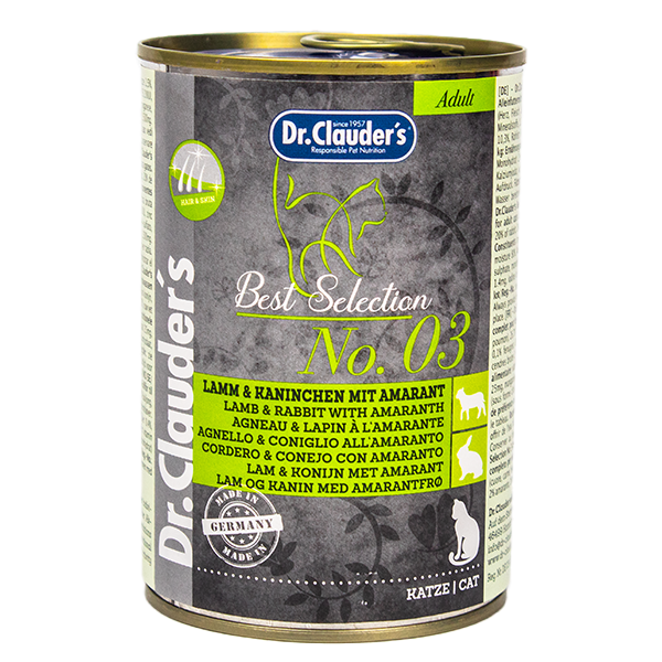 Alimento húmedo para gatos adultos equilibrado y sabroso con alto contenido de carne. Promueve huesos sanos, tejidos fuertes y función cerebral óptima. Incluye aceite de linaza para mejorar la salud de la piel y el pelaje. Ingredientes: Carne de cordero 50% (corazón, carne, hígado, pulmones), 26,7% caldo, 20% conejo, 2% amaranto, 1% minerales, 0,2% aceite de linaza, 0,1% fenogreco. Componentes analíticos: proteína bruta 10,3%, grasa bruta 6%, ceniza bruta 2,5%, fibra bruta 0,4%, humedad 80%.