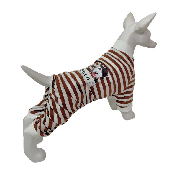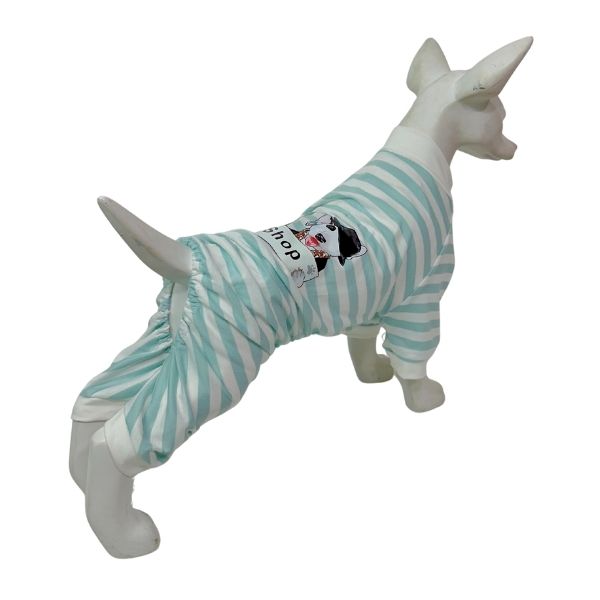 Enterizo de rayas para mascotas con estampado de perritos. Material: Poliéster Color: Verde, café Disponible: Razas pequeñas