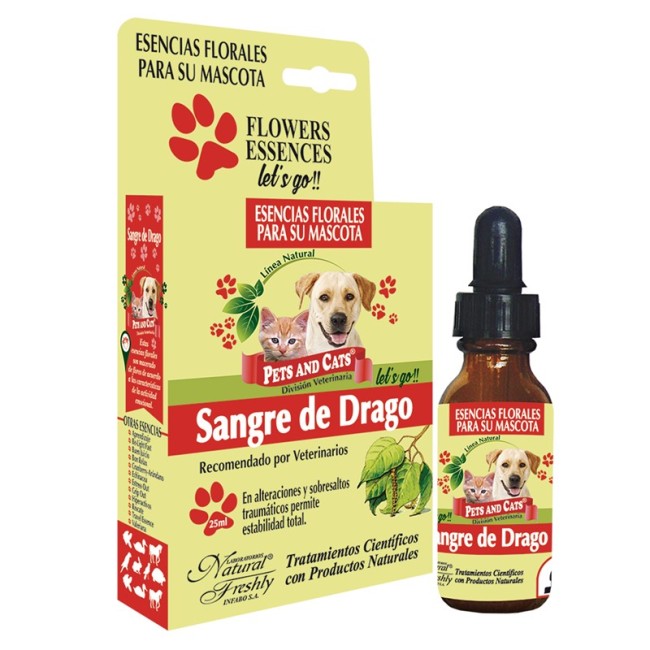 Esencia sangre de Drago lets go Natural Freshly es un potente cicatrizante, analgésico y antibacterial, se puede dar como preventivo o como curativo. Útil en heridas de la piel por enfermedades y lesiones. Ingredientes: Armonica asociación de esencias florales. Presentación: Frasco x 25 ml con gotero Disponible: Para perros y gatos de todas las razas y edades.
