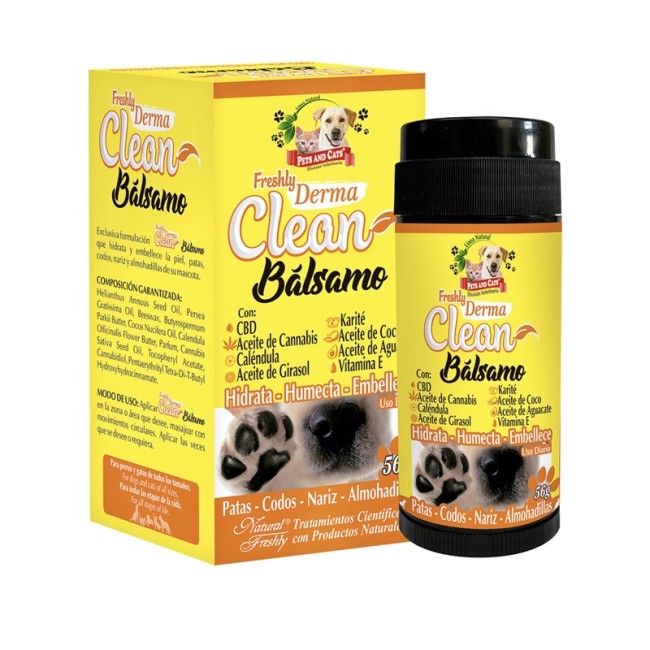 Freshly Derma Clean Balsamo Roll On Natural Freshly hidrata y embellece la piel, patas, codos, nariz y almohadillas de su mascota. Ingredientes: CBD, aceite de cannabis, caléndula, aceite de girasol, karité, aceite de coco, aceite de eucalipto, vitamina E. Presentación: Frasco x 56 g. Disponible: Para perros y gatos de todas las razas y edades.