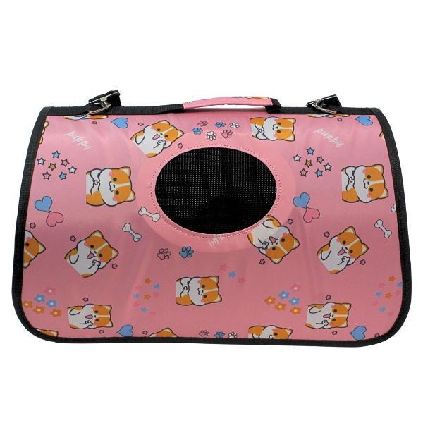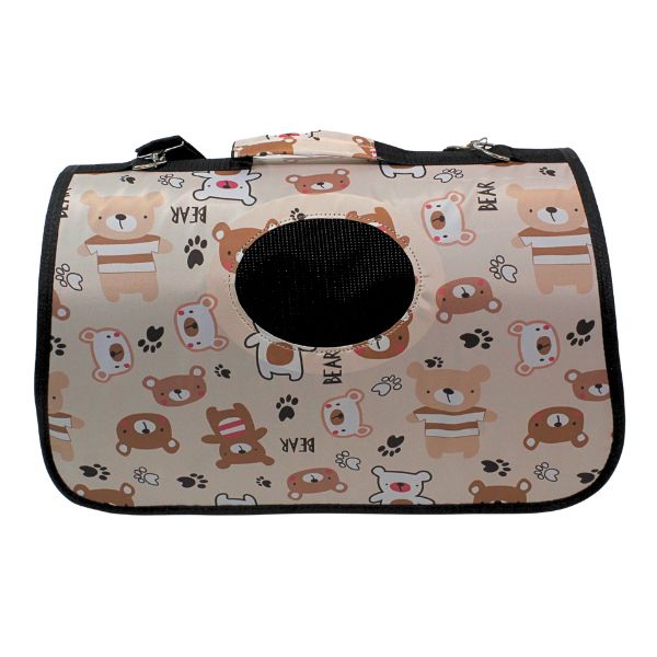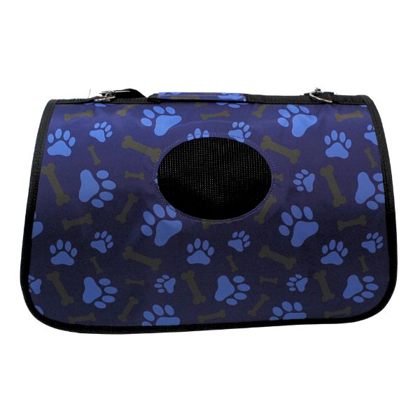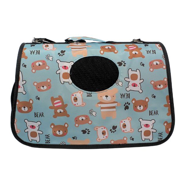 Guacal de tela estampado, cuenta con malla transpirable en los costados, cremallera al rededor y tirilla para poder transportar. Material: Poliéster Color/Estampado: Azul claro oso, azul oscuro huella, beige oso, rosado perro Disponible: Razas pequeñas.