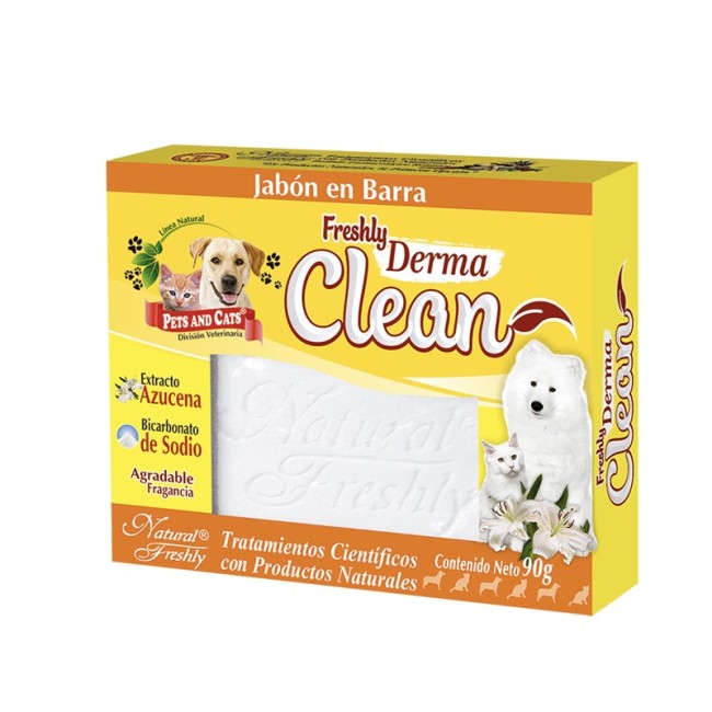 El jabón en barra Freshly Derma Clean hidrata, humecta, limpia, acondiciona, suaviza y embellece el pelo y la piel de su mascota. Ingredientes: Extracto de azucena, bicarbonato. Presentación: Barra x 90 g. Disponible: Para perros y gatos de todas las razas y edades.