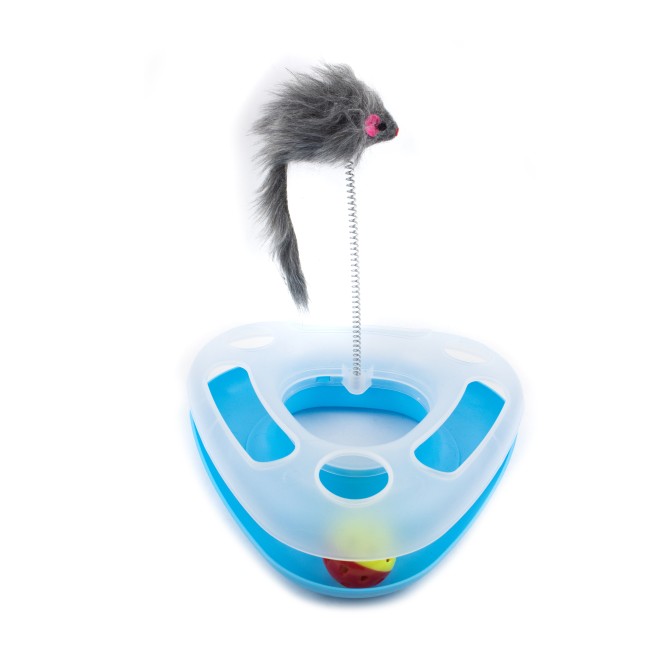 Juguete interactivo con pista de pelotas, cuenta con un resorte con ratón de felpa. Material: Plástico, poliéster Color: Rosado, azul Disponible: Razas pequeñas.