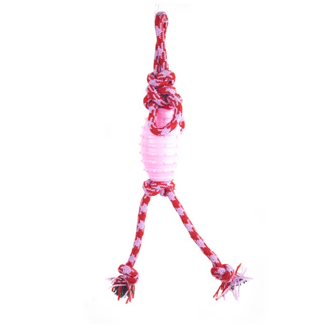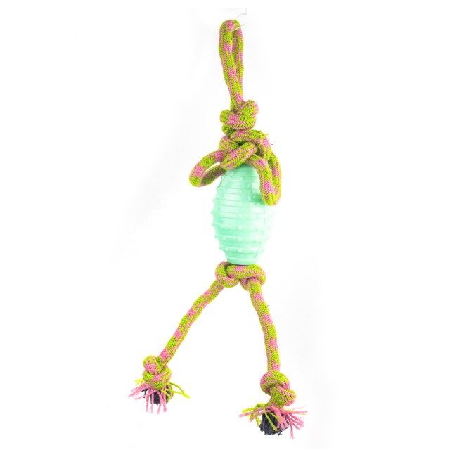 Juguete mordaza, cuenta con cuerda bicolor. Material: Plástico, Poliéster Color: Verde, azul, rosado Disponible: Razas medianas.