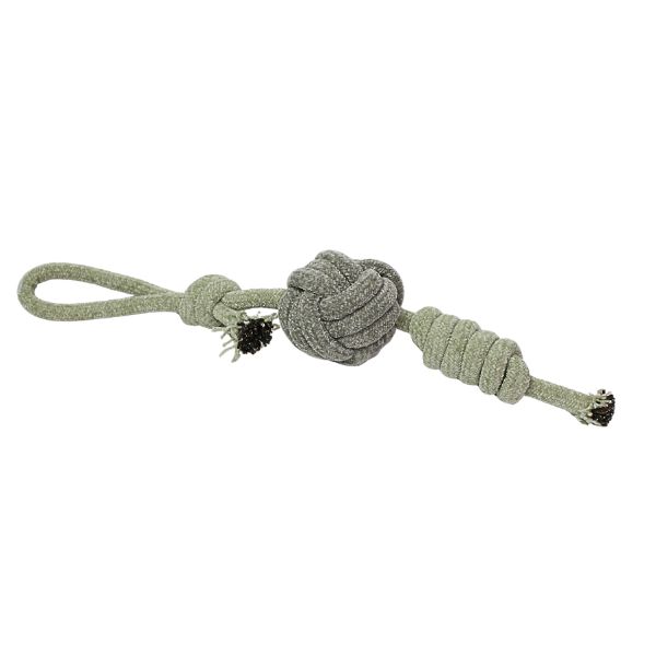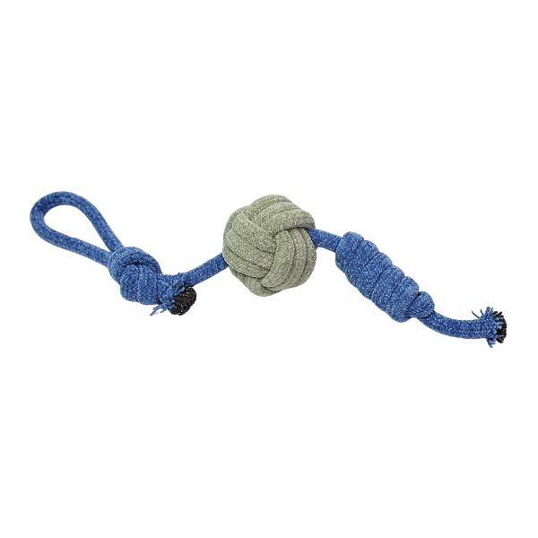 Juguete cuerda para perros, cuenta acabado afelpado, nudos en los extremos y nudo central tipo pelota. Material: PoliƩster Color: Azul con gris, gris Disponible: Razas medianas y grandes