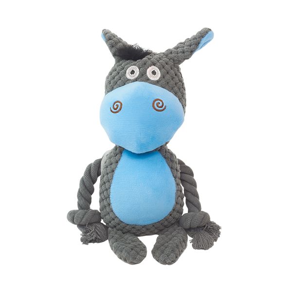 Juguete de tela para mascotas con sonido chillón interno y cuerda trenzada para morder. Material: Poliéster Diseño: Burro, reno Disponible: Razas pequeña