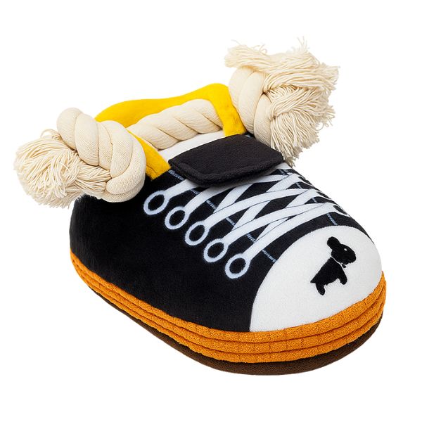 Juguete zapato de tela para mascotas con sonido chillón interno y cuerda trenzada para morder. Material: Poliéster Color: Rosado, negro, azul Disponible: Razas pequeñas y medianas