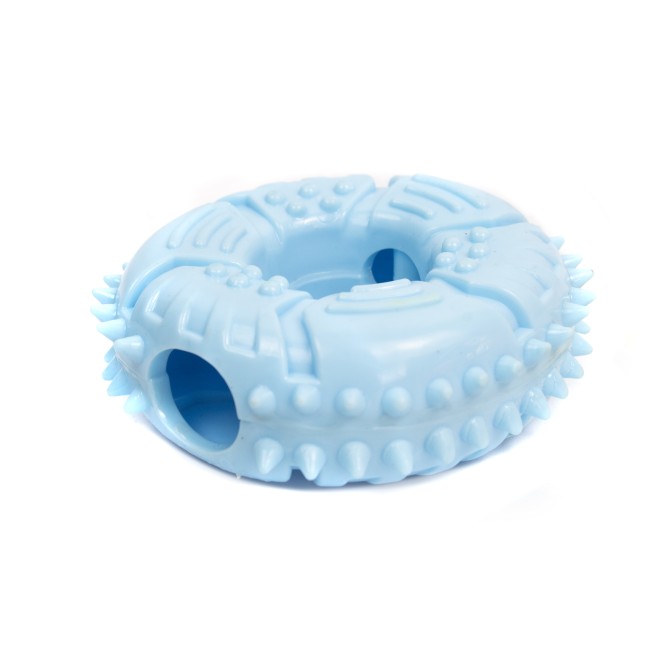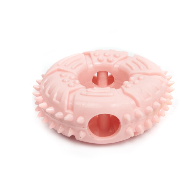 Juguete dona con orificios para agregar croquetas. Material: Plástico Color: Naranja, verde, azul, rosado Disponible: Razas medianas
