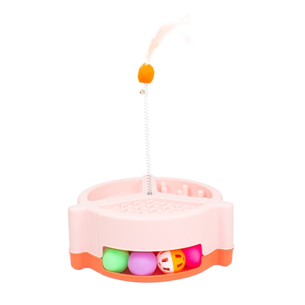 Juguete interactivo combinación de comedero y pista de pelotas, cuenta con cuatro pelotas y alambre con plumas para incrustar en el centro. Empaque en plástico. Material: Plástico Color: verde, azul, naranja Disponible: Razas pequeñas