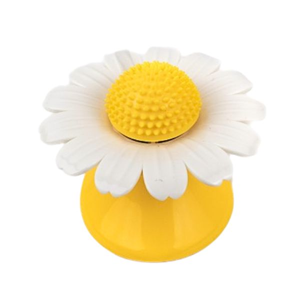 Juguete interactivo con diseño de margarita, cuenta con ventosa para fijar a superficies planas, luces led, pétalos giratorios, botón extraíble con textura y bolita de catnip. Material: ABS, goma, catnip Color: Amarillo Disponible: Razas pequeñas.