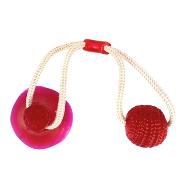 Juguete mordaza, cuenta con pelota y una ventosa para adherir a superficies planas. Material: PoliƩster, caucho Color: Azul, verde, rojo Disponible: Razas medianas y grandes.