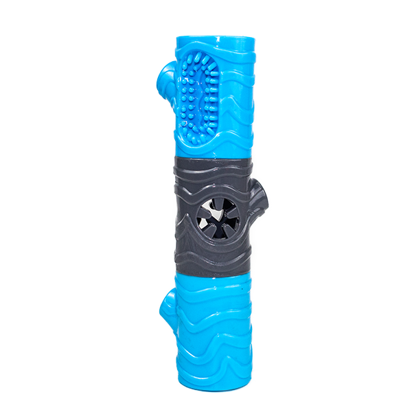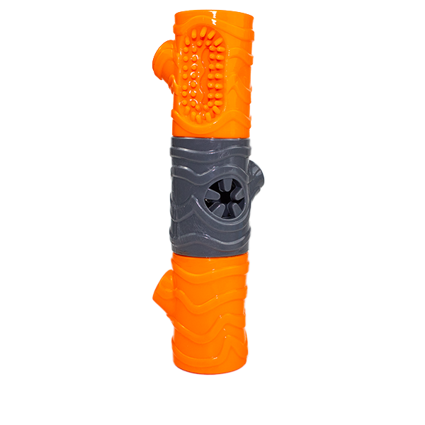 Juguete mordedor para mascotas, cuenta coon compartimentos para esconder snacks, textura para ayuda de limpieza de dientes y sonido interno. Material: Plástico Color: Azul, naranja Disponible: Razas medianas y grandes