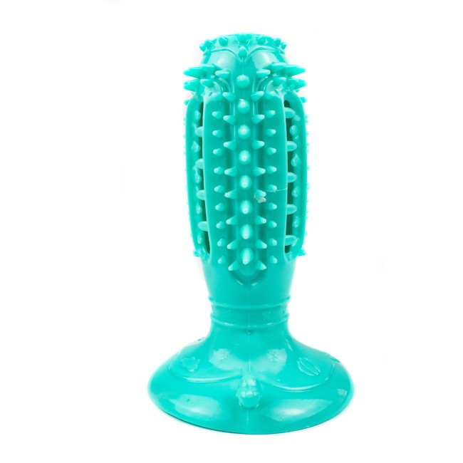Juguete mordedor, cuenta con cubierta de púas ideal para ayudar con la limpieza de dientes y encías de su mascota, orificios en los costados y ventosa para fijar a superficies planas. Material: Plástico Color: Amarillo, verde, azul, rosado Disponible: Razas medianas y grandes.