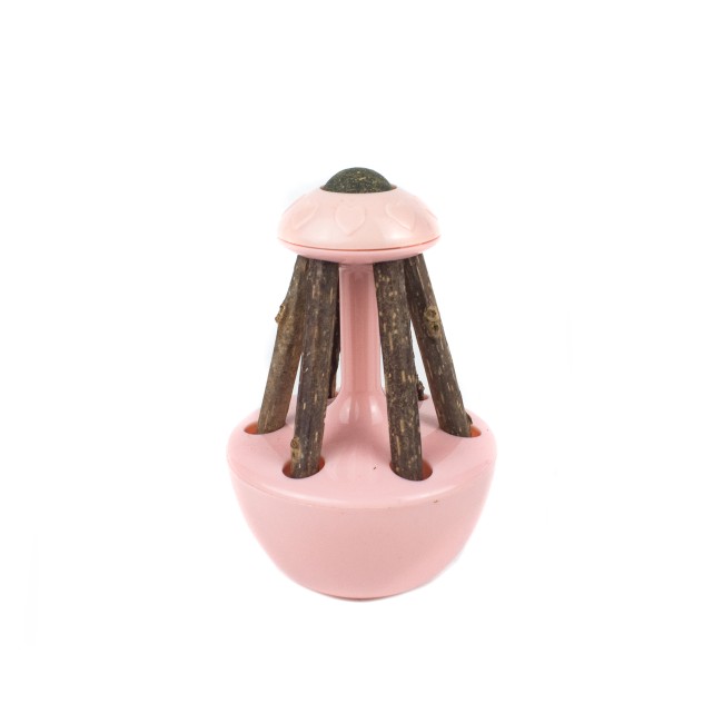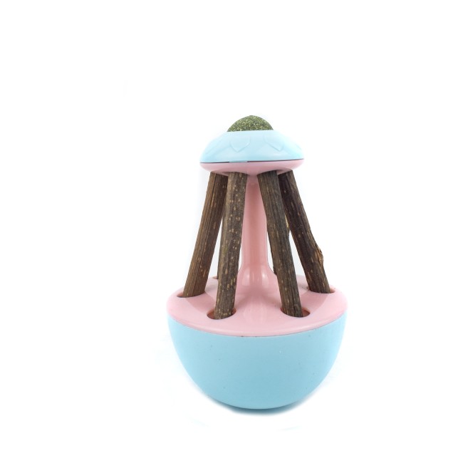 Juguete interactivo, cuenta con base semiesférica, palitos de matatabi y bolita de catnip en la parte superior. Material: Plástico, matatabi, catnip Color: Azul, rosado, amarillo Disponible: Razas pequeñas.