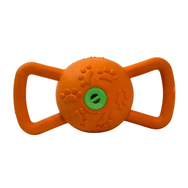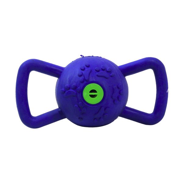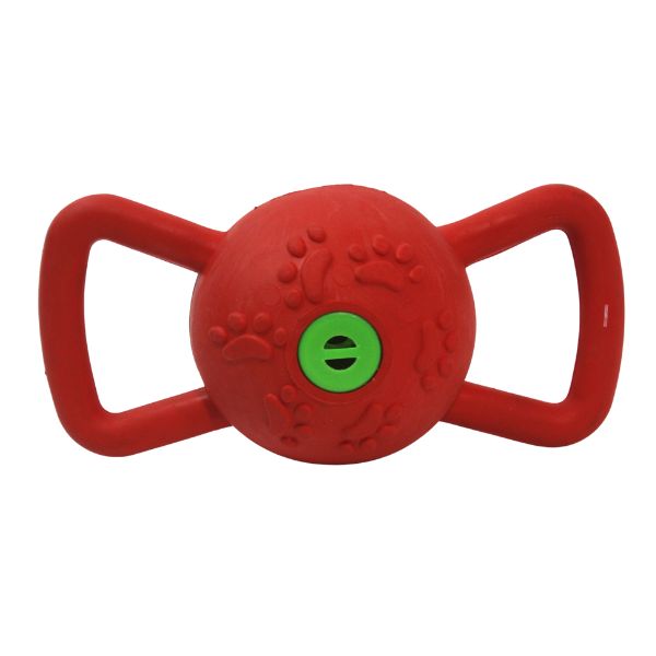 Juguete pelota con sonido interno y agarre para jalar. Material: Caucho Color: Naranja, rojo, azul Disponible: Razas medianas y grandes