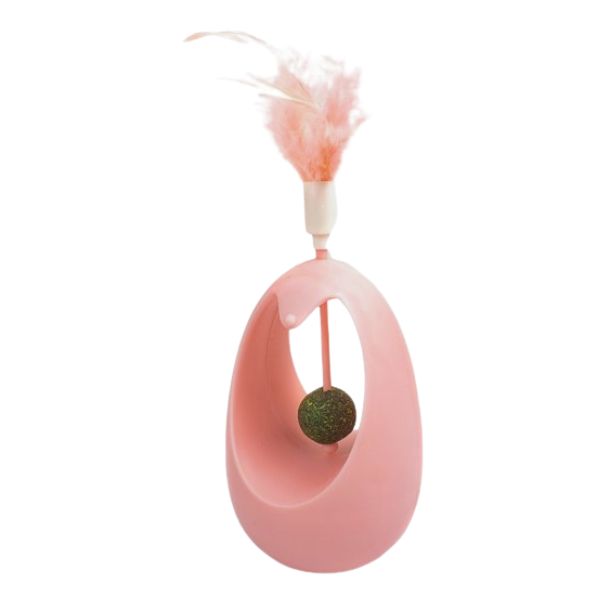 Juguete interactivo con diseño de péndulo, cuenta con base semiesferica, bolita de catnip y pluma en la parte superior. Material: Plástico, catnip Color: Rosado, azul, amarillo Disponible: Razas pequeñas.