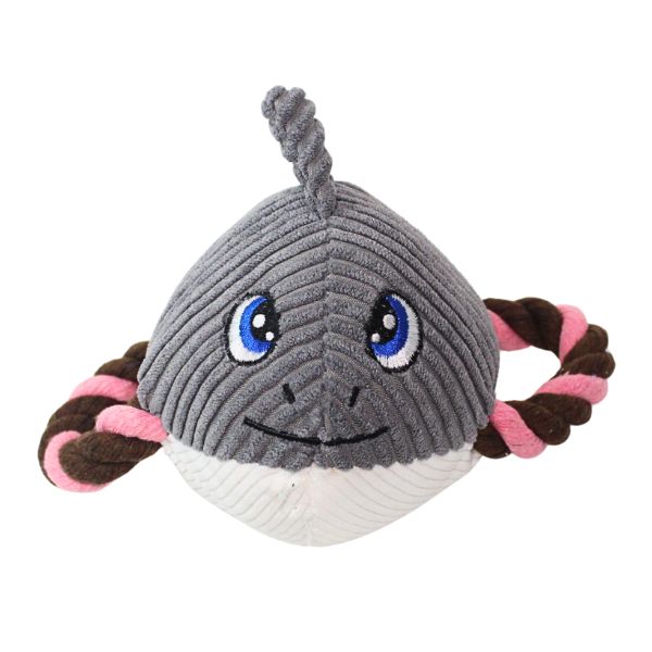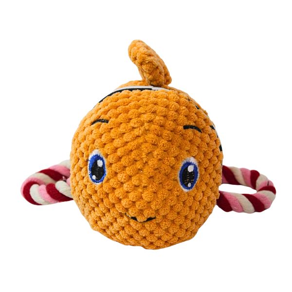 Juguete de tela para mascotas con sonido chillón interno y cuerda trenzada para morder. Material: Poliéster Diseño: Pez payaso, tiburón Disponible: Razas pequeñas y medianas