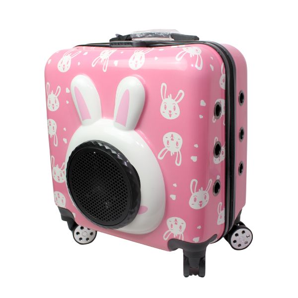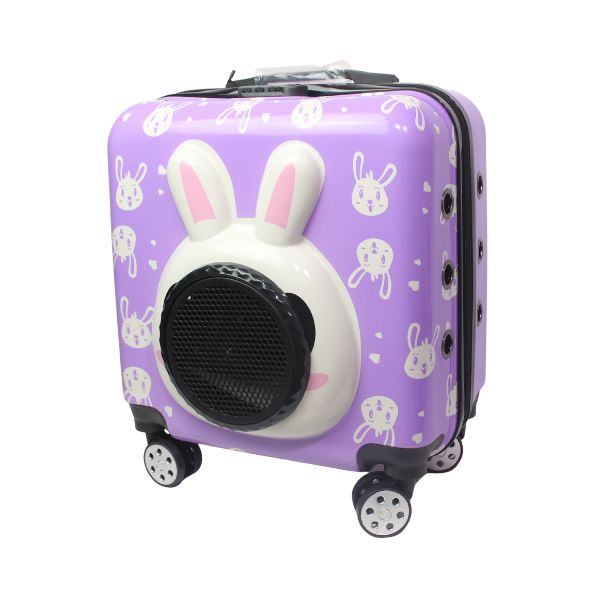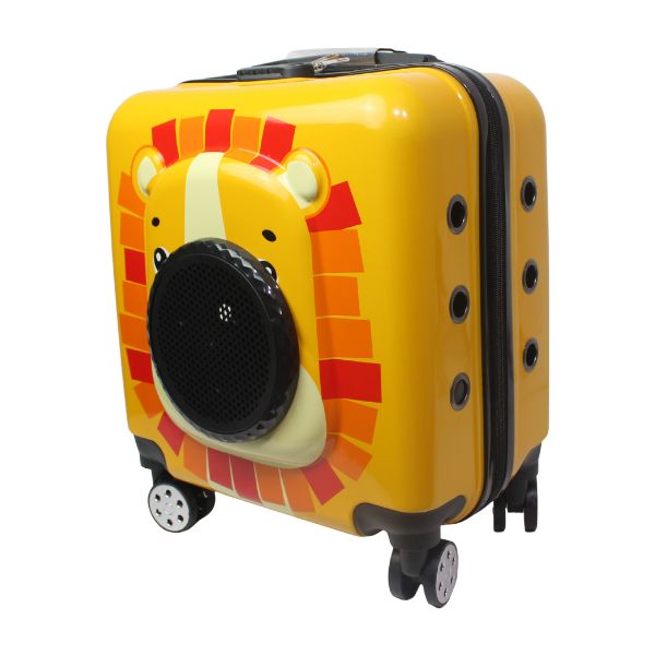 Maleta de ruedas rigida para mascotas, cuenta con manija con botón para ajustar el tamaño, rejilla y anillos a los costados de ventilación, cupula intercambiable, tapete y correa interna para ajutar al collar o arnés. Material: Plástico Diseño: Amarillo jirafa, naranja león, morado conejo, rosa conejo Disponible: Razas pequeñas
