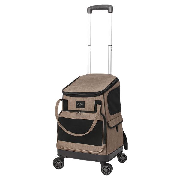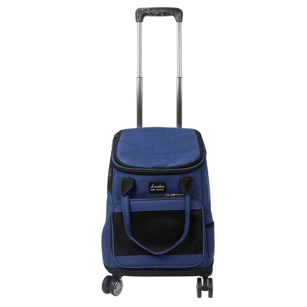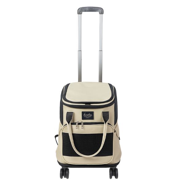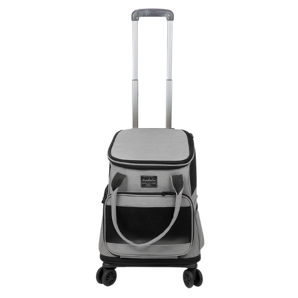 Transportin de ruedas desmontable con ruedas giratorias y manija para graduar el tamaño, cuenta con maletin con ventanas en malla, tapa superior en malla con cubierta para tapar o mantener descubierto, bolsillos a los costados con cremallera, tapete interno con acabado afelpado y correa interna para ajustar al collar o arnés de su mascota. Puede llevarse de distintas maneras: Maleta, transportin de ruedas o bolso de mano. Material: Poliéster, plástico Color: Crema, marrón, gris, azul Disponible: Razas pequeñas