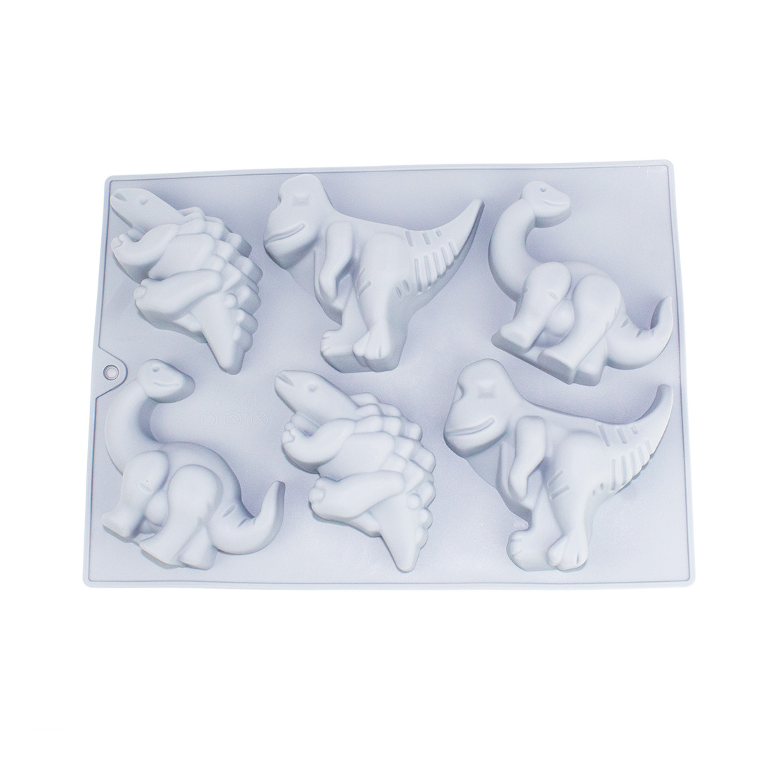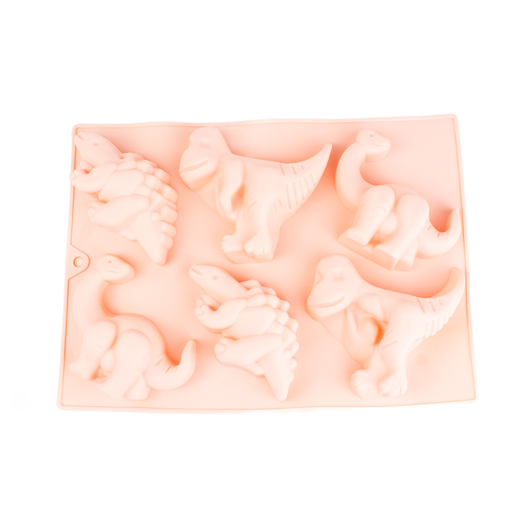 Molde de repostería de dinosaurios. Material: Silicona Color: Gris, salmón, verde menta