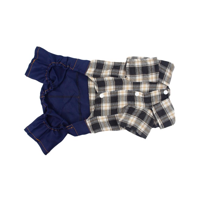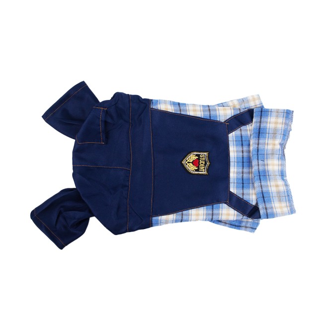 Overol student para mascotas, cuenta con bolsillo decorativo, camisilla estilo tartán y botones inferiores para apuntar. Material: Poliéster Color: Azul, rosado, rojo, negro Disponible: Razas pequeñas y medianas.