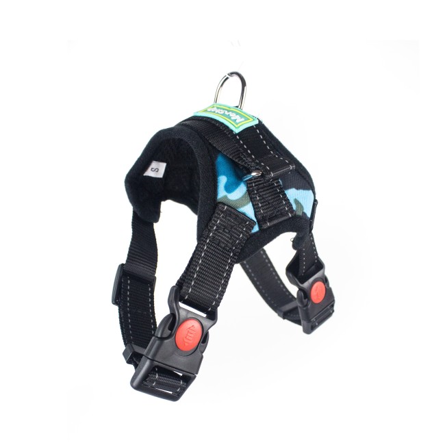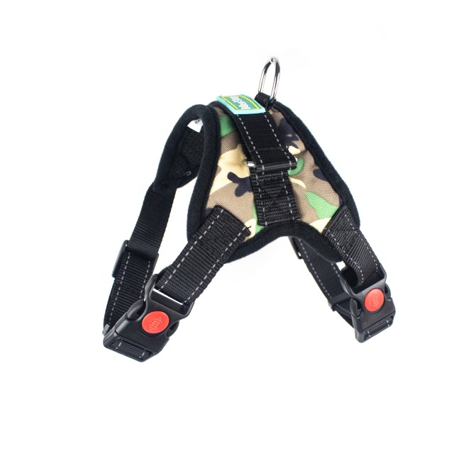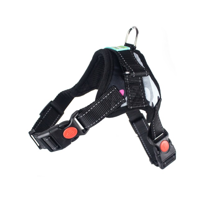 Pechera con sistema anti-tirones cuenta con broche de seguridad, correas con tejido reflectivo y anillo tipo D para fijar la correa.
