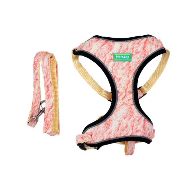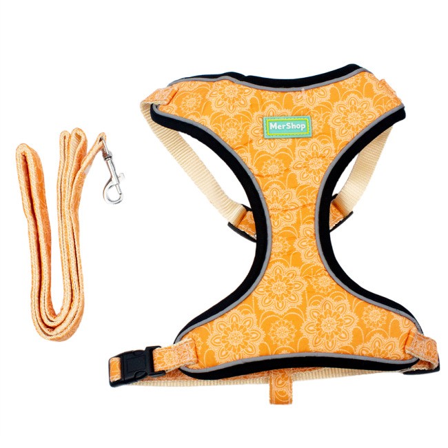 Pechera tipo H estampada, cuenta con hebillas ajustables, tejido reflectivo, broche de seguridad al costado y anillo tipo D para fijar la correa. Material: Poliéster Color/Estampado: Rosado con blanco, rosado playa, naranja mandala, naranja triangulos. Disponible: Razas pequeñas,medianas