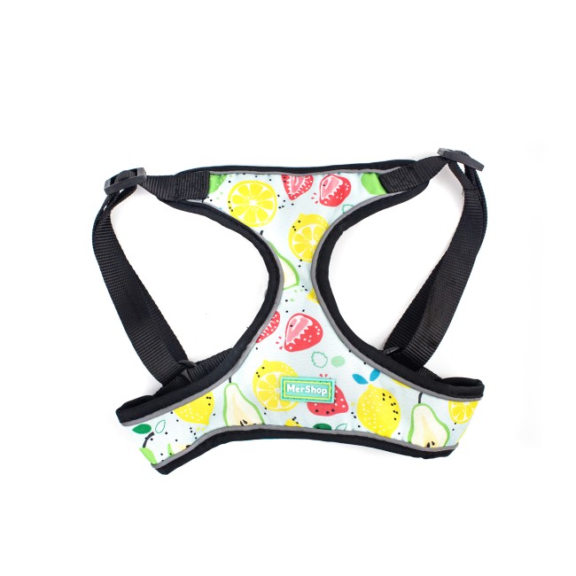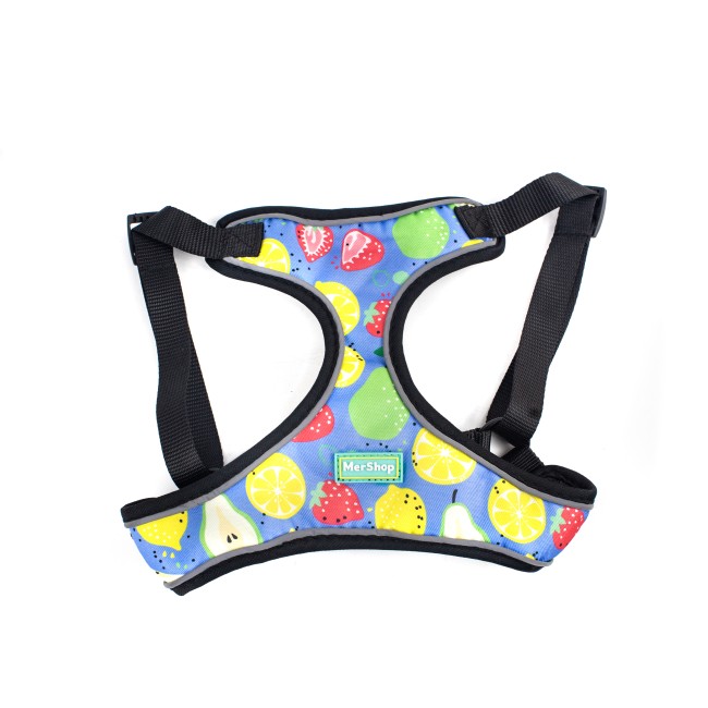 Pechera con estampado de frutas, cuenta con bordes reflectivos, hebillas ajustables, broche de seguridad y anillos tipo D para fijar la correa. Material: Poliéster, metal Color: Rosado, celeste, azul rey, azul claro Disponible: Razas pequeñas, medianas y grandes Medidas: TALLA M: CUELLO 40-53 CM TORSO MIN-MAX 56-58 PESO MAXIMO – APROX 11-23 KG TALLA L: CUELLO 46-66 CM TORSO MIN-MAX 61-76 CM PESO MAXIMO APROX 23-36 KG TALLA XL: CUELLO 70-81 CM TORSO MIN-MAX 70-82 CM PESO MAXIMO – APROX 36-50 KG TALLA XXL: CUELLO 77-98 CM TORSO MIN-MAX 86-102CM PESO MAXIMO – APROX 51-80 KG