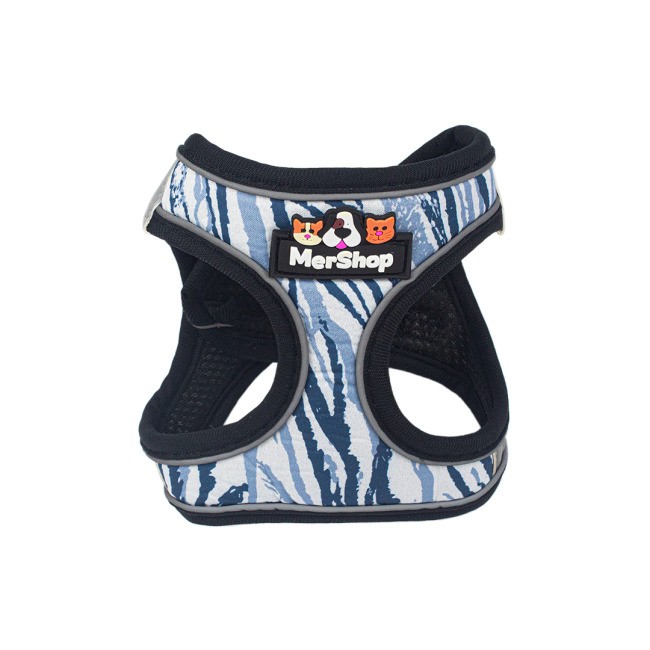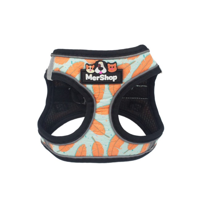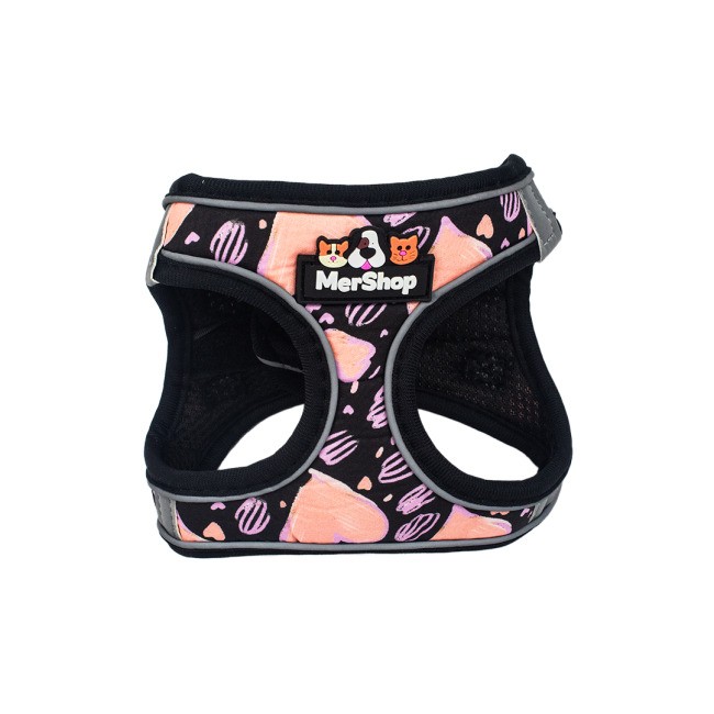 Pechera estampada para mascotas, cuenta con tejido reflectivo, velcro ajustable, broche de seguridad y anillos tipo D para fijar la correa. Material: Poliéster Color/Estampado: Rosado, negro, azul, verde. Disponible: Razas pequeñas.