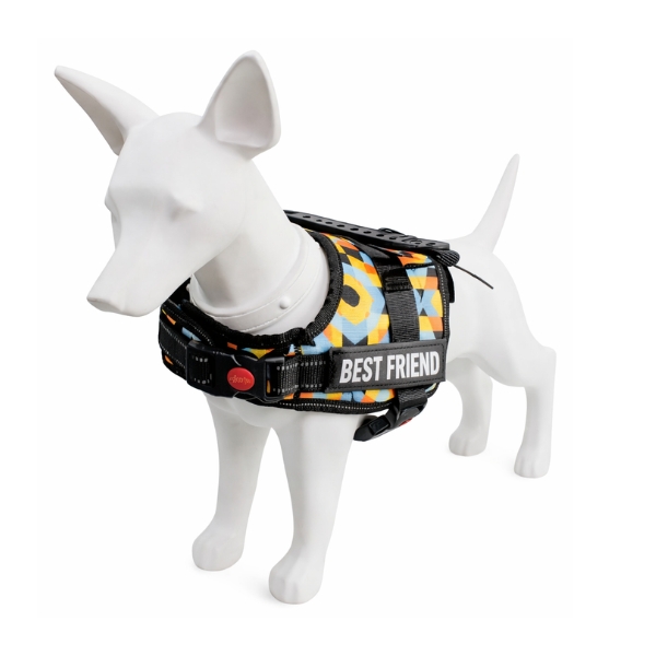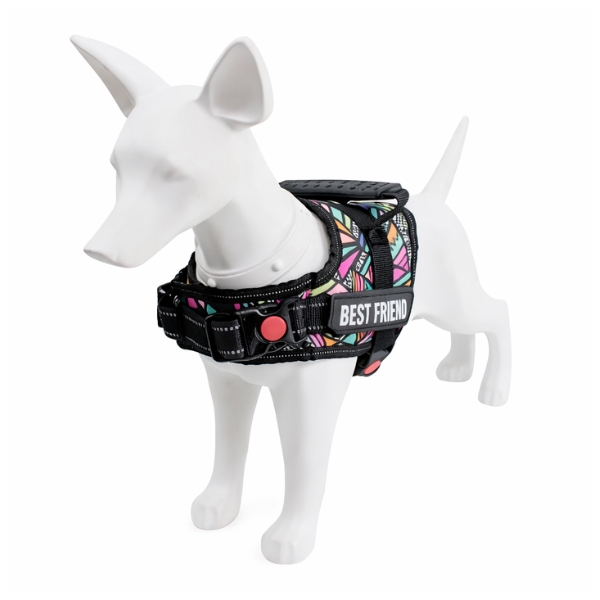 Pechera police K9 con sistema anti-tirones cuenta con velcro ajustable y broche de seguridad, tejido reflectico, velcro adhesivo personalizable en los costados y anillo tipo D grande para fijar la correa. TALLA S CUELLO 30-41 CM TORSO MIN-MAX 41-53 CM PESO MAXIMO – APROX 5-11 KG TALLA M CUELLO 40-53 CM TORSO MIN-MAX 56-58 PESO MAXIMO – APROX 11-23 KG TALLA L CUELLO 46-66 CM TORSO MIN-MAX 61-76 CM PESO MAXIMO APROX 23-36 KG TALLA XL CUELLO 70-81 CM TORSO MIN-MAX 70-82 CM PESO MAXIMO – APROX 36-50 KG TALLA XXL CUELLO 77-98 CM TORSO MIN-MAX 86-102CM PESO MAXIMO – APROX 51-80 KG Material: Poliéster, metal Estampado: Triangulo multicolor, mandala rosado, geometrico naranja Disponible: Razas pequeñas, medianas y grandes