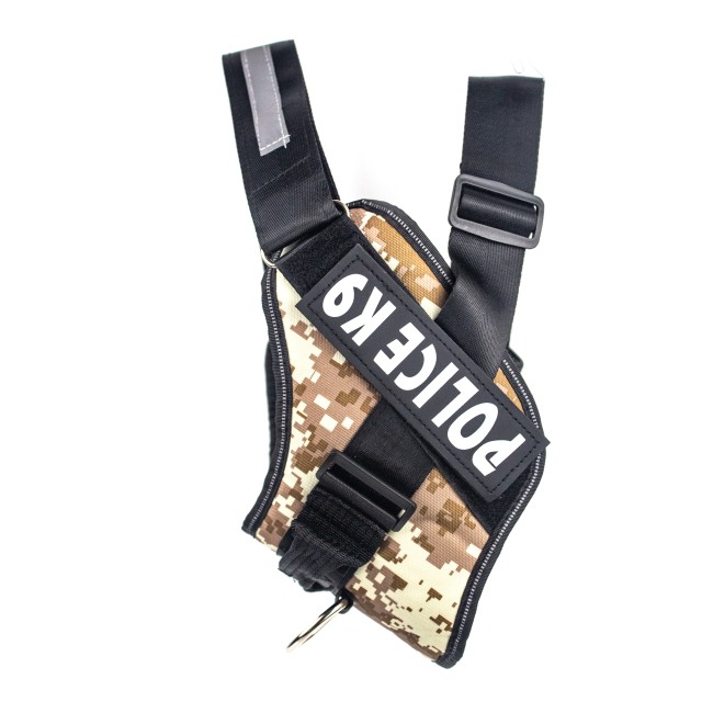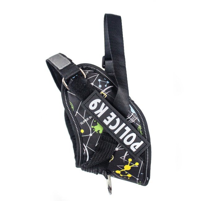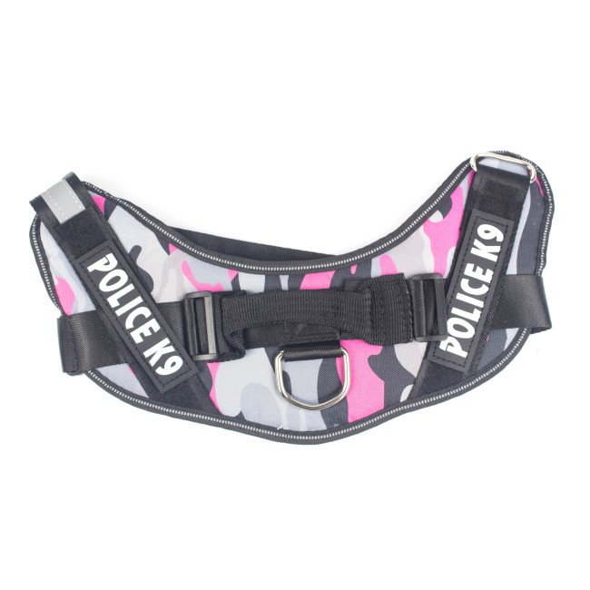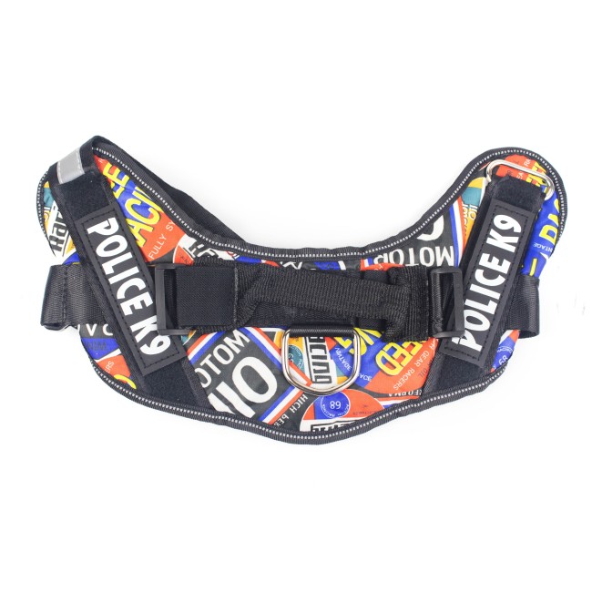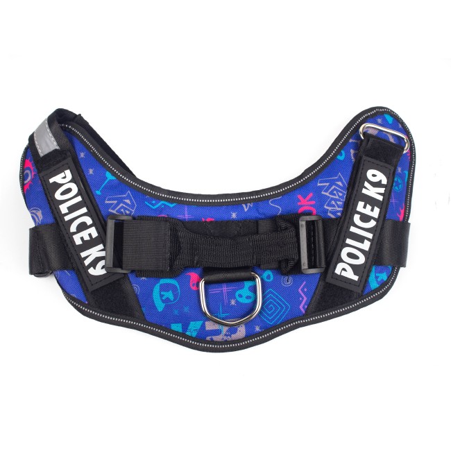 Pechera police con sistema anti-tirones cuenta con una cintilla de velcro ajustable y tejido reflectico, broche de seguridad, velcro adhesivo personalizable en los costados y anillo tipo D grande para fijar la correa. Material: Poliéster, metal Color: Verde, beige, rosada, morado, negro, rojo con negro. Disponible: Razas pequeñas