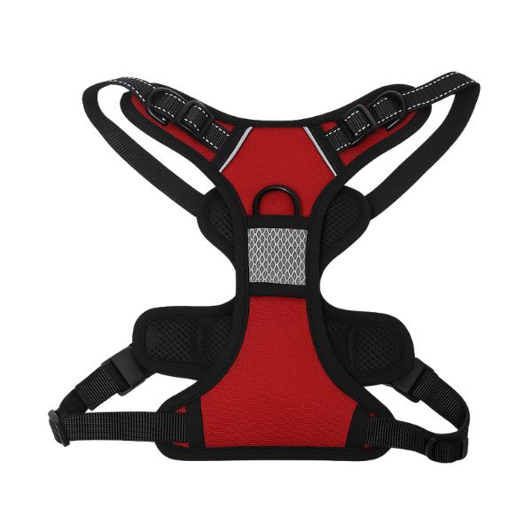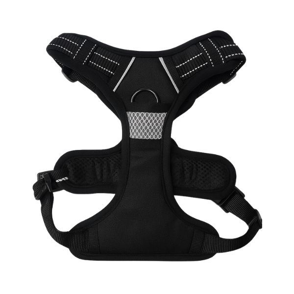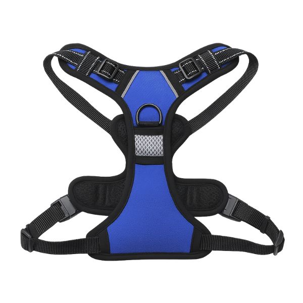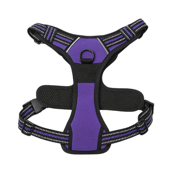 Pechera con tejido reflectivo, cuenta con broches de seguridad, anillos tipo D para fijar la correa, malla interna transpirable acolchada y hebillas ajustables. Material: Poliester, metal Color: Negro, azul, rojo, morado Disponible: Razas medianas y grandes