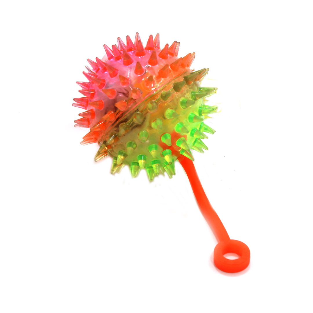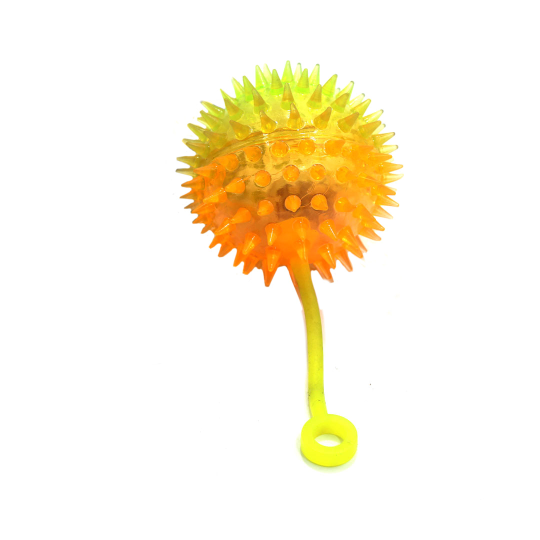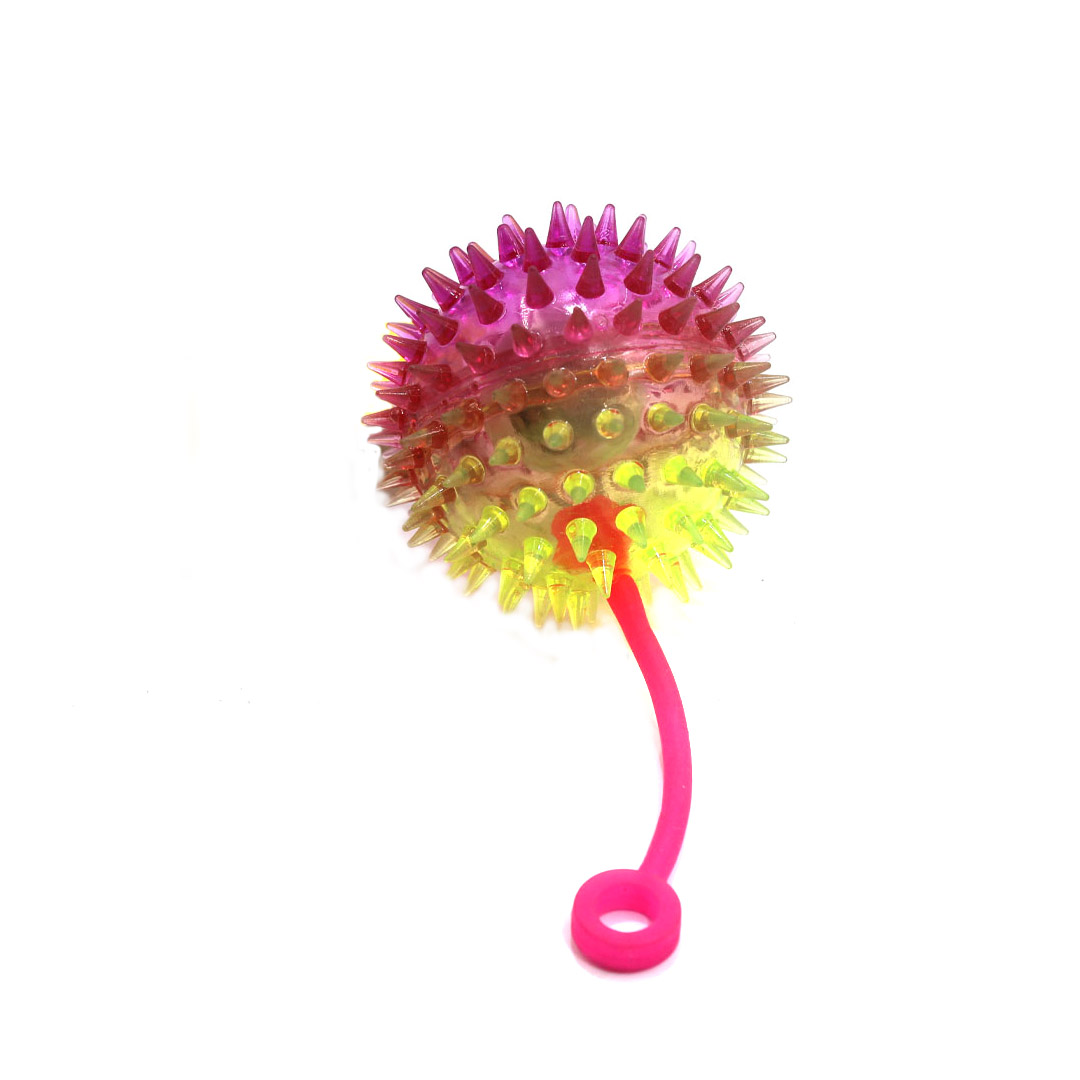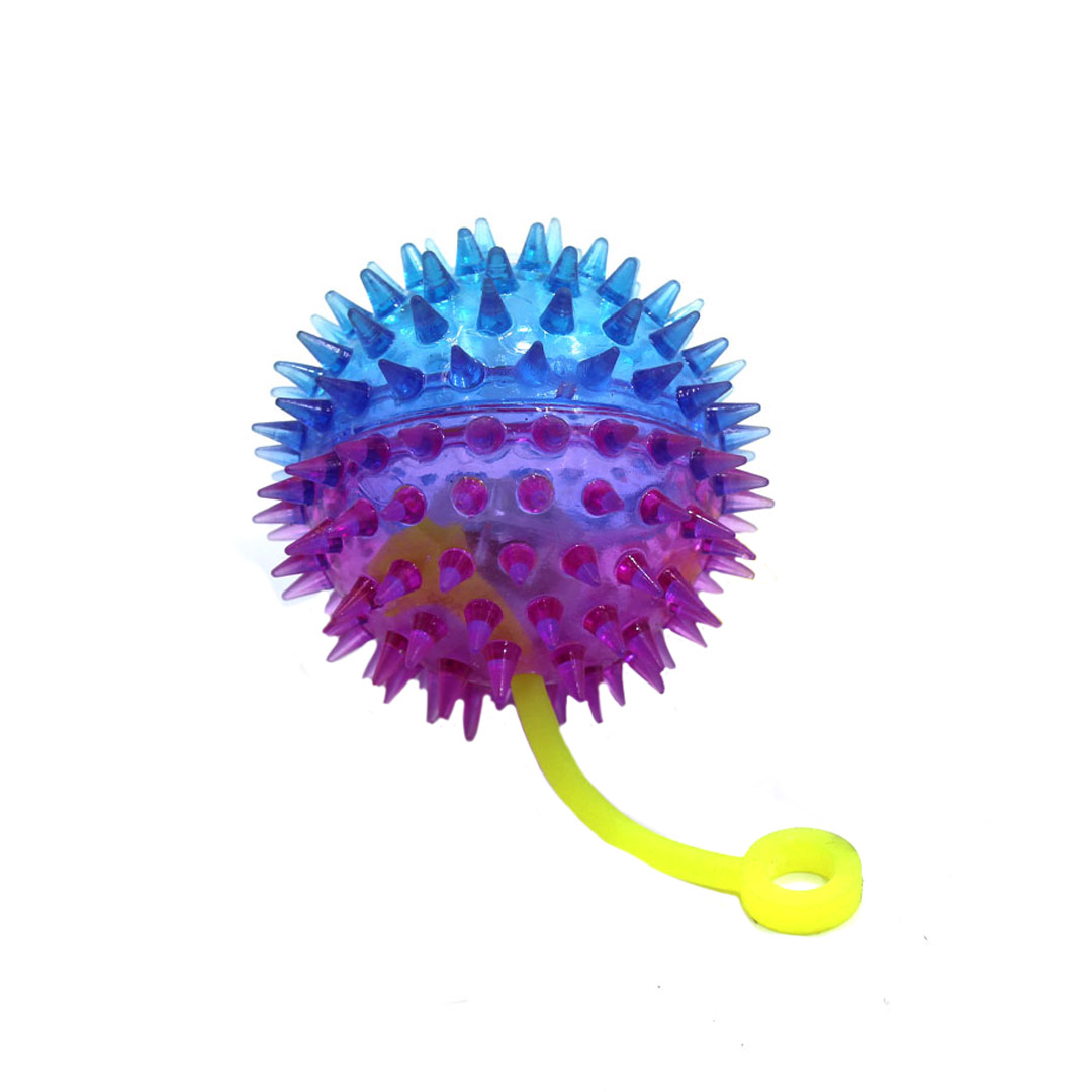 Pelota bicolor, cuenta con textura de púas, luz led interna y tirilla para tener un mejor agarre. Material: Caucho Color: Rosado, amarillo, azul Disponible: Razas pequeñas.