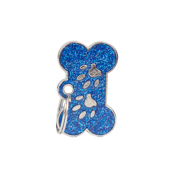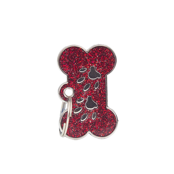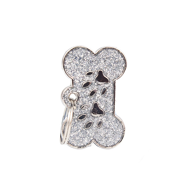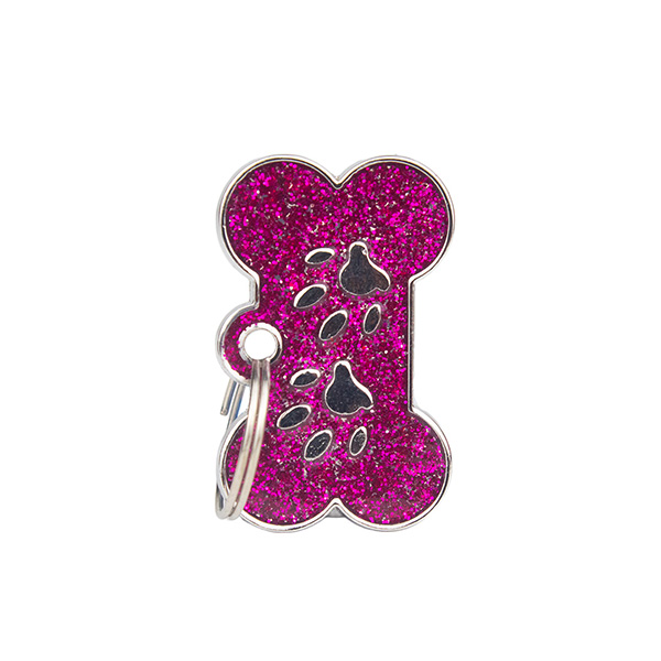 Placa de identificación hueso con estampado de huellas, cuenta con acabado escarchado. Material: MetalColor: Rojo, fucsia, morado, rosado, plateado, azul Disponible: Razas pequeñas y medianas.