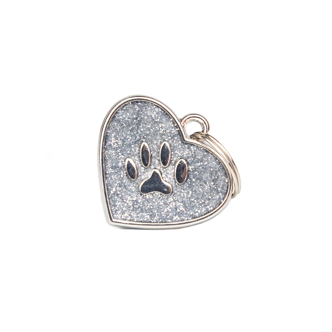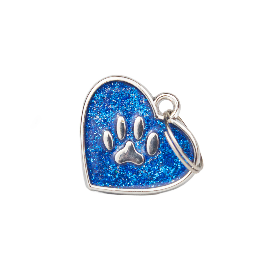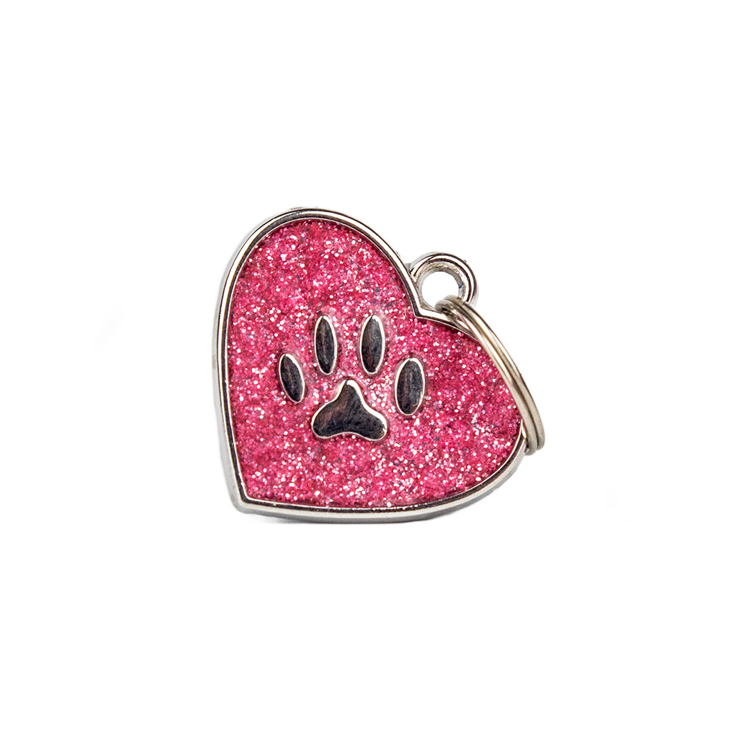 Placa de identificación con acabado escarchado, cuenta con forma de corazón y grabado de huella. Material: Metal Color: Rosa, rojo, negro, azul, plateado, fucsia. Disponible: Razas pequeñas y medianas.