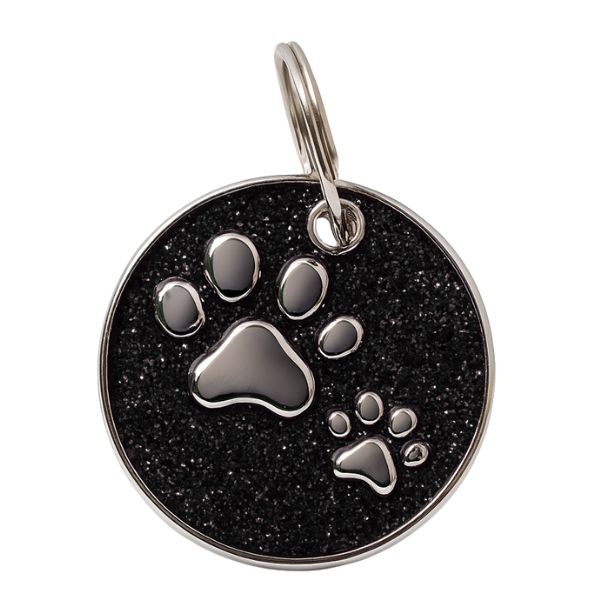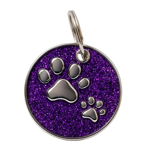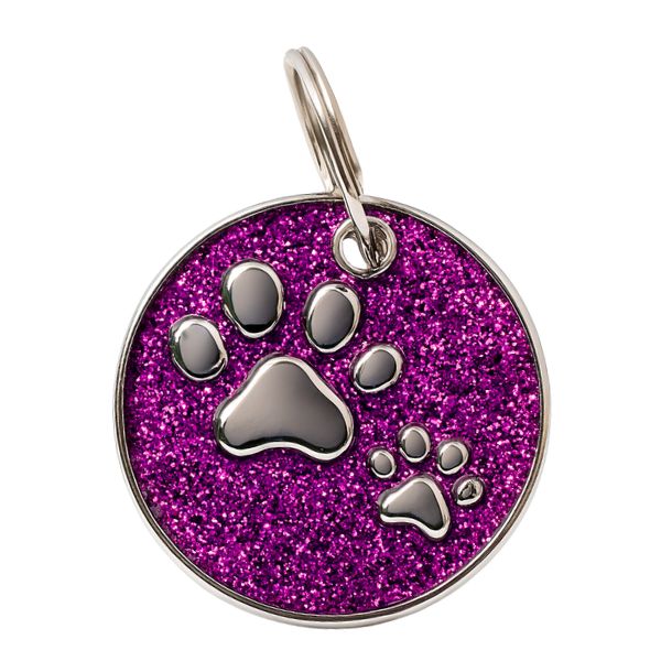 Placa de identificación redonda con estampado de huellas y acabado escarchado. Material: Metal Color: Azul, negro, plateado, rosa, fucsia, morado Disponible: Razas pequeñas y medianas