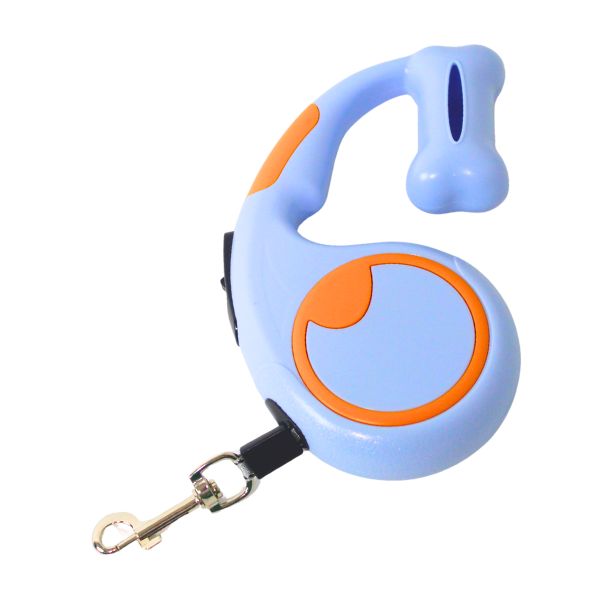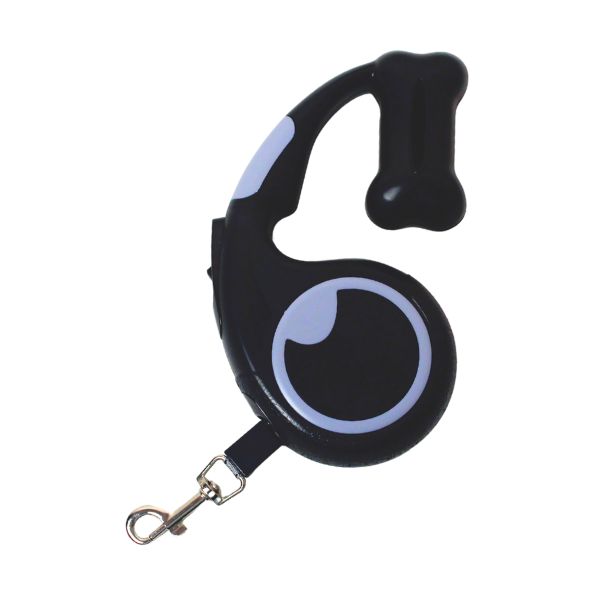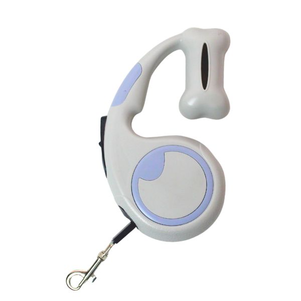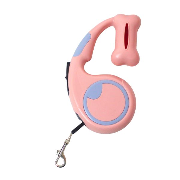 Correa retractil para mascotas, cuenta con botón para fijar la correa y con un compartimento para guardar las bolsas. Material: Plástico Color: Negro, gris, rosado, azul Disponible: Razas pequeñas y medianas