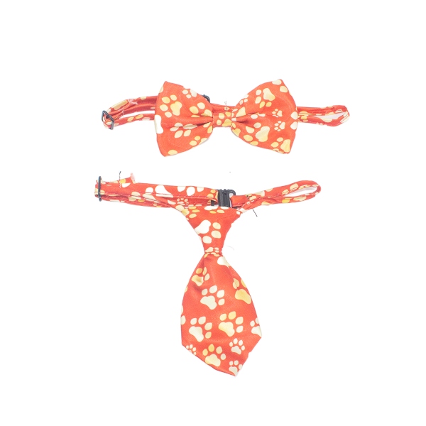 Set corbata y corbatín para mascotas, cuentan con broches de seguridad. Material: Poliéster Color/estampado: Morado huellas y huesos, azul estrellas, rojo huellas, negro puntos, negro huellas, morado gatos. Disponible: Razas pequeñas y medianas.