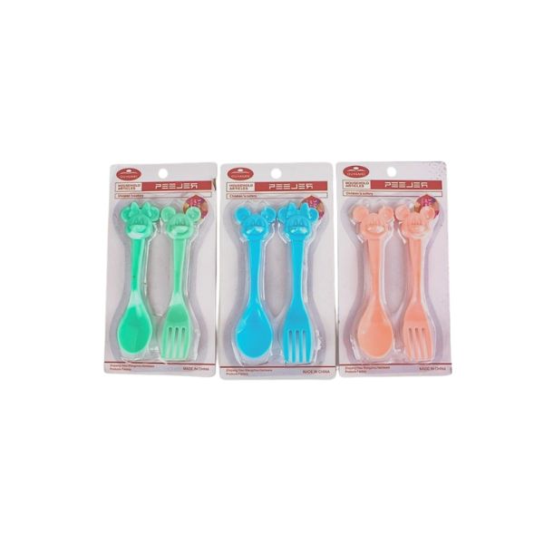 Cuchara y tenedor con diseño de Mickey Mouse. Material: Plástico Color: Verde, azul, rosado.