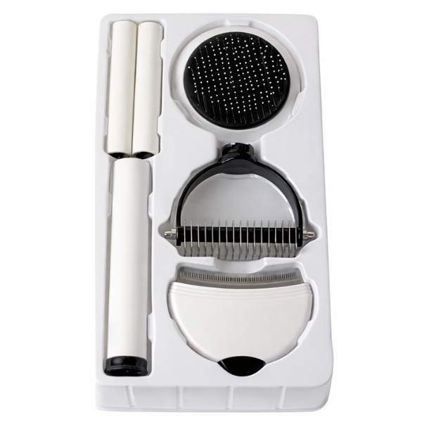 Set de cepillos para mascotas, cuenta con tres cabezas intercambiables para diferentes necesidades de cepillado y removedor de pelo inferior con dos repuestos.