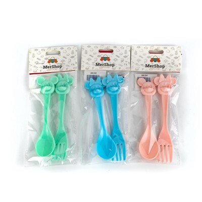 Cuchara y tenedor con diseño de Mickey Mouse. Material: Plástico Color: Verde, azul, rosado.