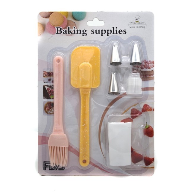 Set de repostería, cuenta con brocha, espátula miserable, manga y 3 boquillas para decoración. Material: Metal, silicona.