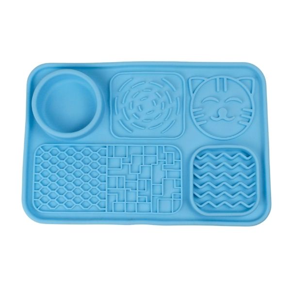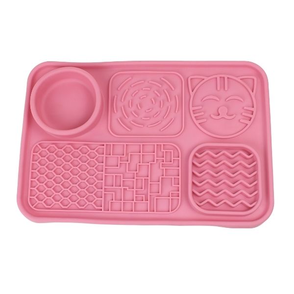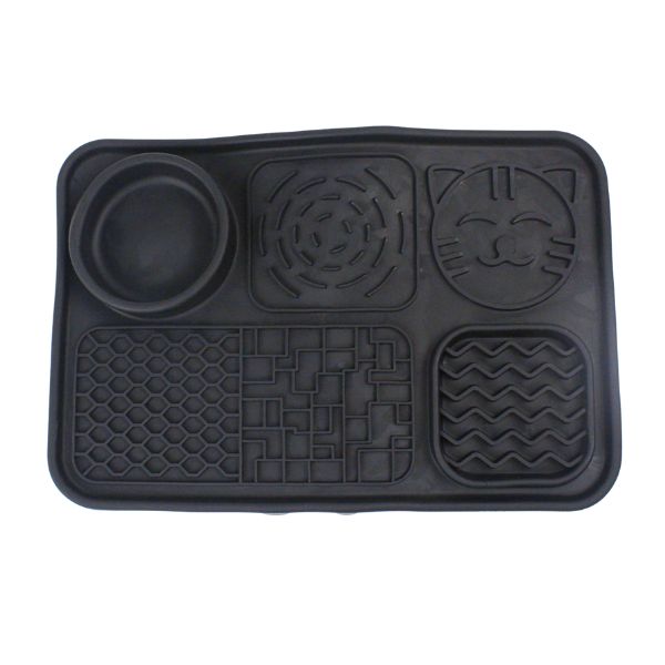 Tapete para lamer ideal para alimentos blandos, presenta diferentes texturas y compartimentos ofreciendo una forma de enriquecimieno metal mientras se alimentan. Trae ventosas para fijar a superficies planas. Material: Silicona Color: Rosado, negro, azul Disponible: Razas pequeñas, medianas y grandes
