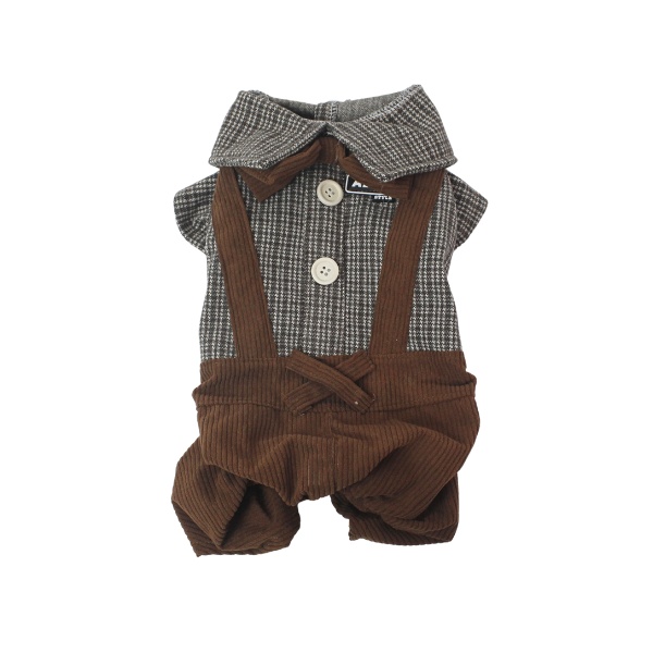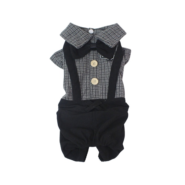 Traje tipo overol para mascotas, cuenta con moño y botones de decoración y botones internos para abrochar. Material: Poliéster Color: Azul, negro café Disponible: Razas pequeñas