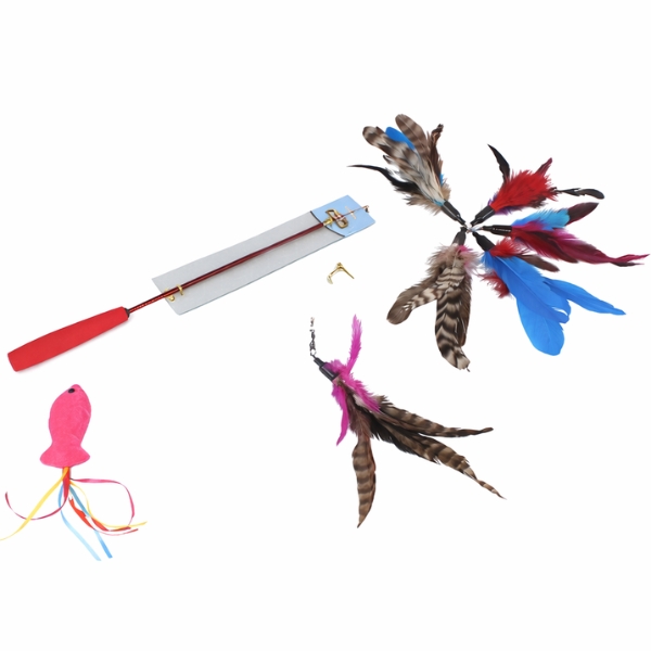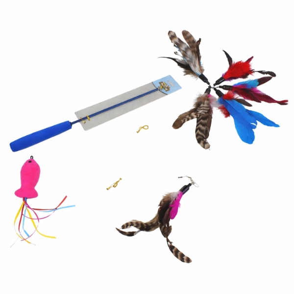 Juguete varita, cuenta con 6 accesorios intercambiables. Ideal para fomentar el instinto de caza y la actividad física en casa. Material: Plástico, plumas Color: Azul, rojo Disponible: Razas pequeñas