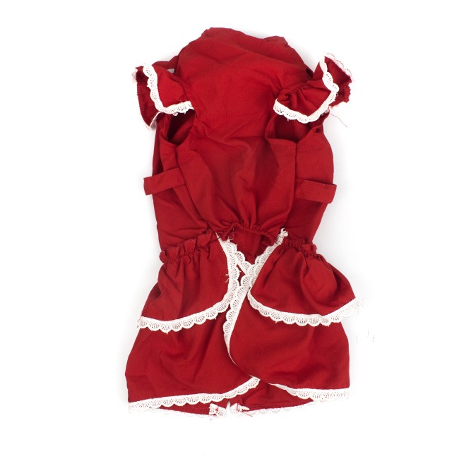 Vestido para mascotas, cuenta con velcro y anillos tipo D para fijar la correa. Material: Poliéster Color: Rojo, rosado, azul Disponible: Razas pequeñas